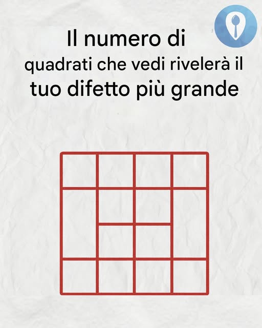 Una versione comune è una griglia 4×4 di quadratini, che insieme formano un quadrato grande. Il puzzle in genere chiede: “Quanti quadrati riesci a trovare in totale?”. La risposta corretta può variare da 16 (contando solo i quadratini più piccoli) a 30 o più se si includono tutte le combinazioni sovrapposte.